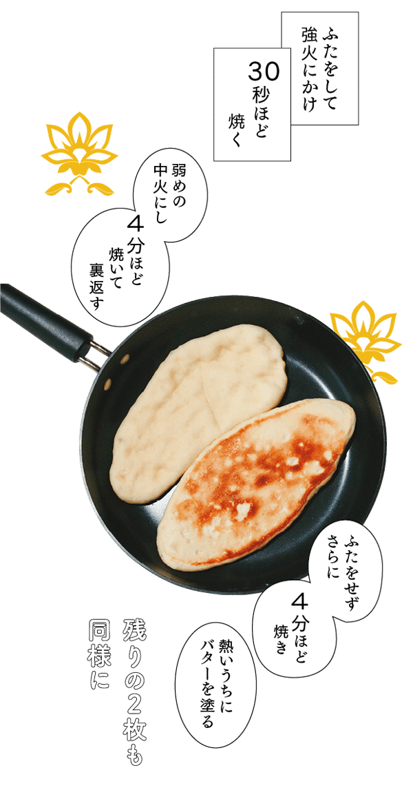ふたをして強火にかけ、30秒ほど焼く。弱めの中火にし、4分ほど焼いて裏返す。ふたをせずにさらに4分ほど焼き、熱いうちにバターを塗る。残りの2枚も同様にする。