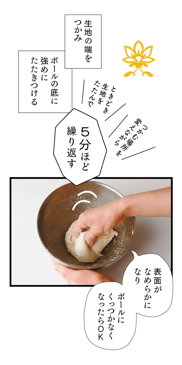 生地の端をつかみ、ボールの底に強めにたたきつける。これを、ときどき生地をたたんでつかむ場所を変えながら、5分ほど繰り返す。表面がなめらかになり、ボールにくっつかなくなったらOK。