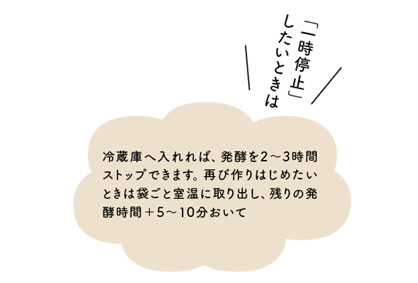 冷蔵庫へ入れれば、発酵を2~3時間ストップできます。再び作りはじめたいときは袋ごと室温に取り出し、残りの発酵時間+5~10分おいて。