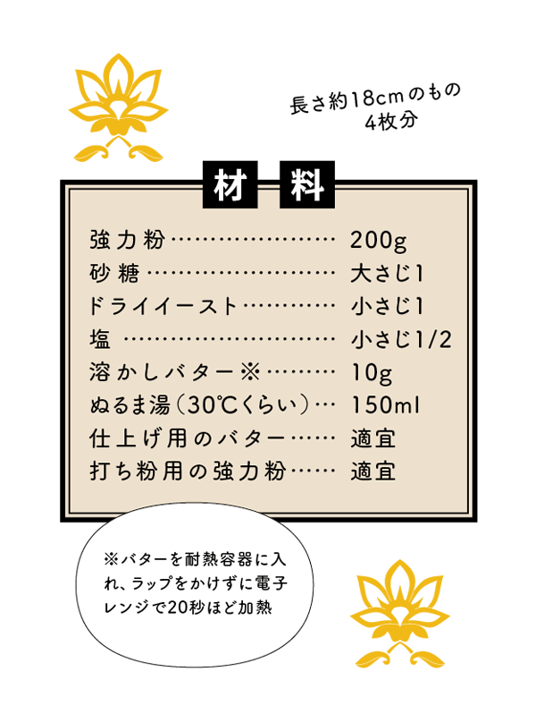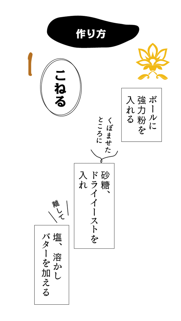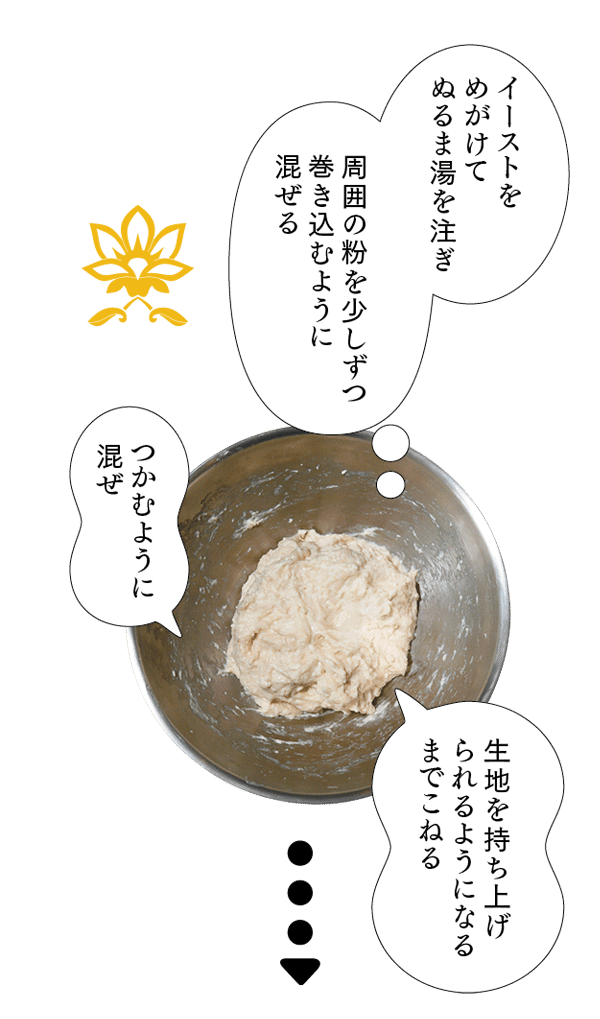 ボールに強力粉を入れる。くぼませたところに砂糖、ドライイーストを入れ、塩、溶かしバターをイーストと離して加える。イーストをめがけてぬるま湯を注ぎ、周囲の粉を少しずつ巻き込むように混ぜる。つかむように混ぜ、生地を持ち上げられるようになるまでこねる。