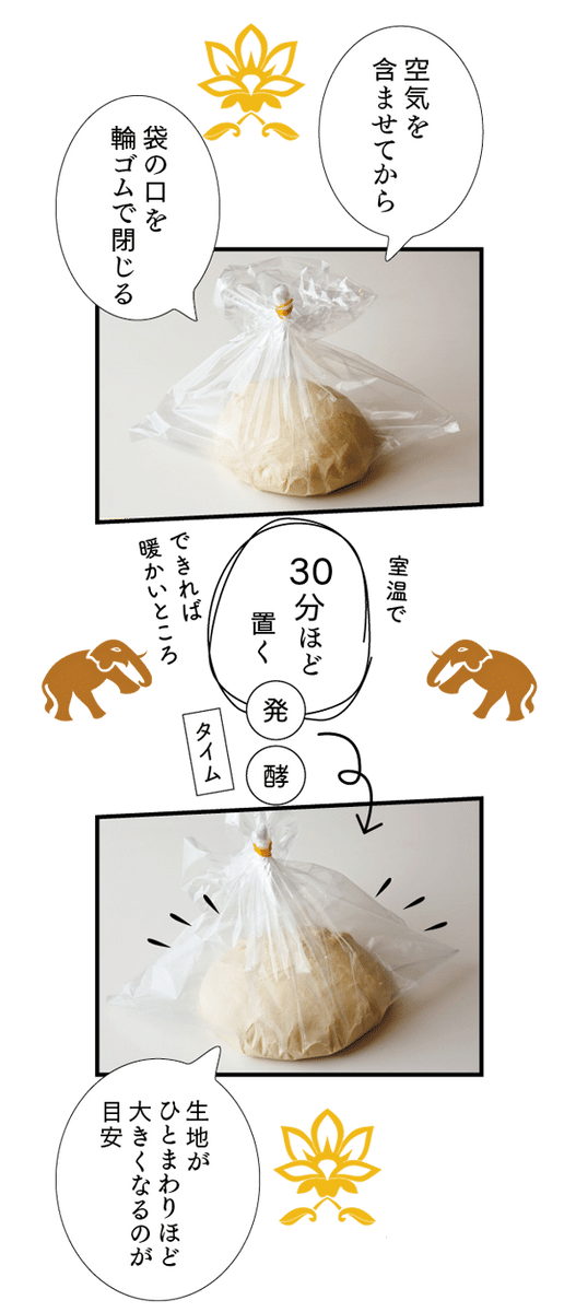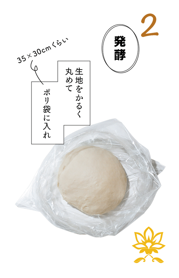 生地をかるく丸めてポリ袋(35×30cmくらい)に入れ、空気を含ませてから袋の口を輪ゴムで閉じる。そのまま室温(できれば暖かいところ)に30分ほど置き、発酵させる。生地がひとまわりほど大きくなるのが目安。