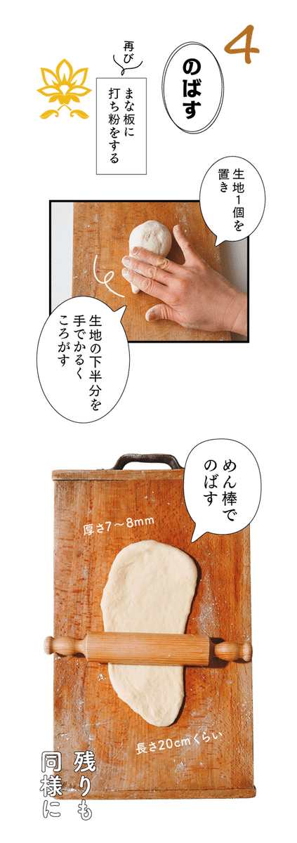 再びまな板に打ち粉をする。生地1個を置き、生地の下半分を手でかるくころがす。そのままめん棒で厚さ7~8mm、長さ20cmくらいのしずく形にのばす。残りも同様にする。