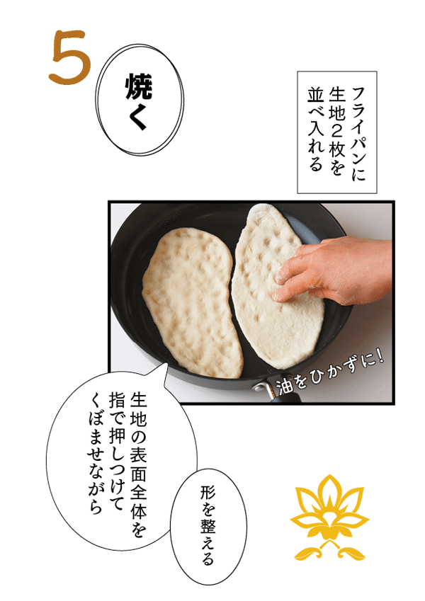 フライパンに油をひかずに、生地2枚を並べ入れる。生地の表面全体を指で押しつけてくぼませながら、形を整える。