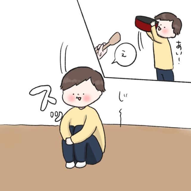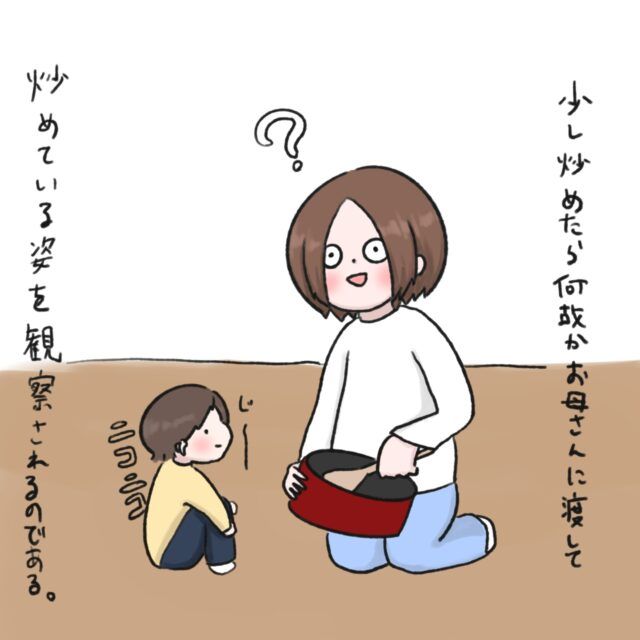 3. めっちゃ見られてるぅ・・。フライパンでおもちゃを炒めるブームな息子のもう1つの楽しみ方|ねむりひつじの子育て絵日記