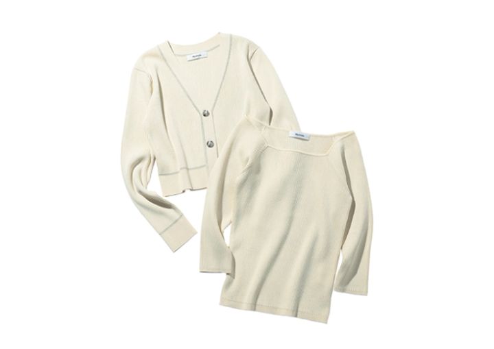 ハリと弾力のあるニット素材は、編み地の違いでセンスを強調。カーディガン¥6,990、ニット¥5,990/ともにPLST