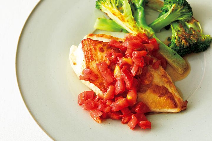 トマトソースで鮮やかに。鶏肉を焼いた後、フライパンに残った脂を利用してフレッシュトマトでささっとつくります。