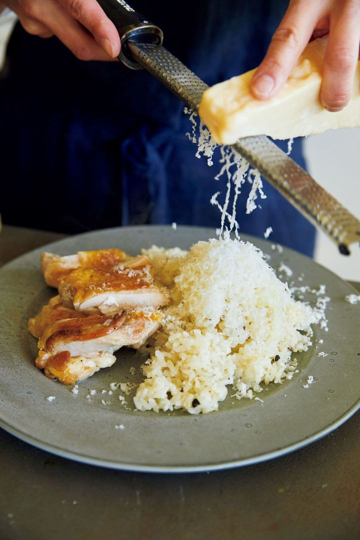 (3)フライパンにサラダ油を強火で熱し、鶏肉を皮目を下にして入れ、焼き目がつくまで5~6分焼く。上下を返してふたをし、5分ほど焼く。塩をふり、食べやすく切る。器に新玉ねぎのライス、チキンソテーを盛り、パルミジャーノを削りながらふる。