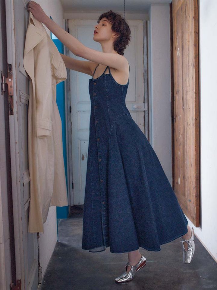 デニムとは思えないほど軽やかにひらつくシルエットを細いショルダーストラップでよりドラマチックに演出。高密度に織り上げたハリのあるデニム地のおかげで優美なフレアラインがくずれにくい。ウエスト部分はシェイプされており、美しいボディラインを形成。ボタンをはずすとフロントを開けられるため、パンツの上からジレのように合わせることも可能。