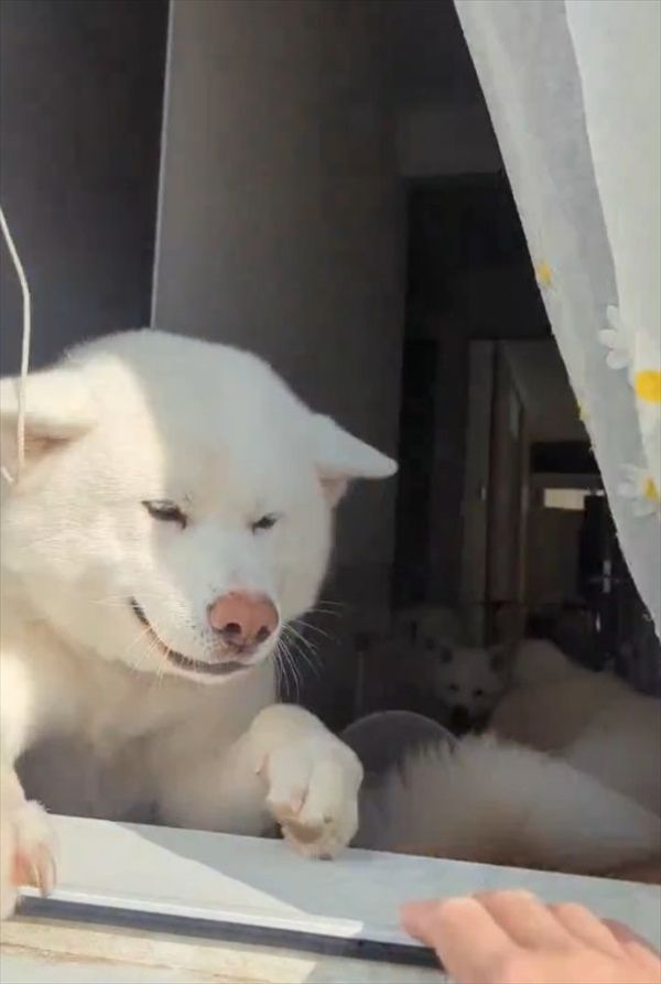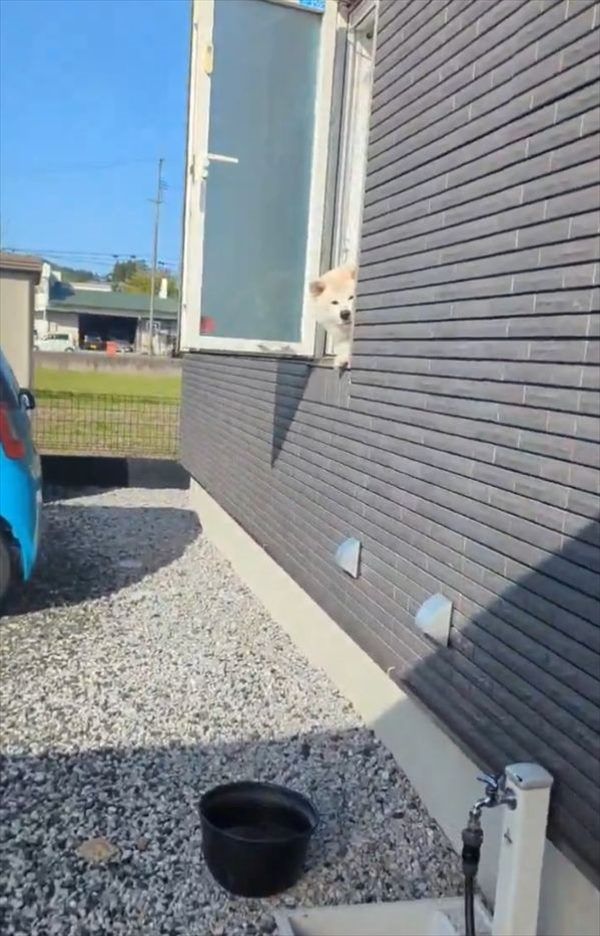 窓から顔を出し、飼い主さんをお出迎えしてくれる秋田犬。 愛らしい光景にほっこりと思ったら・・・、すぐにお家の中に引っ込んでしまいました!!
