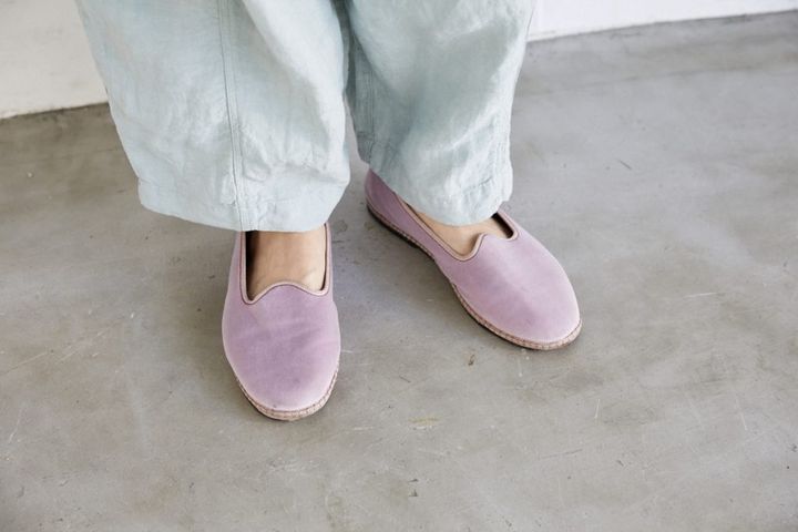 「 イタリアのハンドメイド・シューズブランド《シューシャ》の靴は、はきやすくて何足も持っています。今日のはピンクでもラベンダーでもない、くすんだモーヴがお気に入り。キレイ色だけど素材はベルベット調なので、オールシーズン合わせられます」