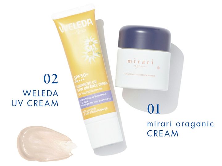 step01.mirari organic トリートメントモイスチャー クリーム 52mL 5,060円 step02.ヴェレダ エーデルワイス UVバリアクリーム SPF50+・PA+++ 60mL 4,400円/ともにコスメキッチン