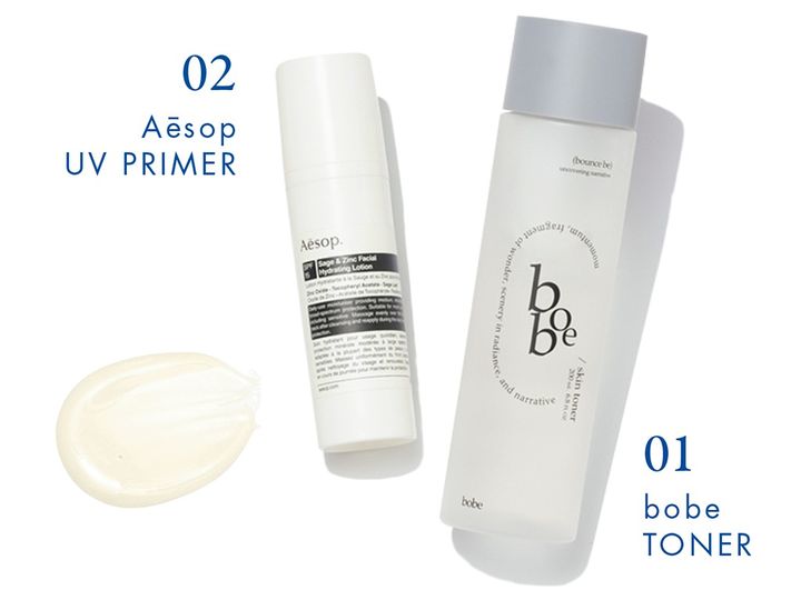 「さっぱりとした使い心地ながら、発酵コラーゲン水が角質層までしっかり届くbobeのスキンケアを使えば、十分にうるおいが閉じ込められ、直後にベースを塗ってもモロモロが出にくく、キレイに仕上がります。日焼け止めとして長年愛用している、保湿力の高いイソップのローションとも相性がよく、どちらも手放せないアイテムです」