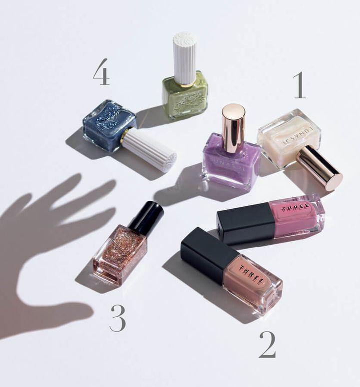 右は乳白色のベースカラーにブルーとピンクのパール入ったネイル。左は貝殻の輝きをイメージしたライラックカラー。ツヤ感のある爽やかなネイルを楽しんで。