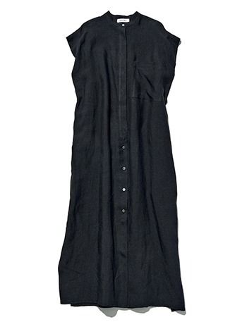 黒リネンハーフスリーブワンピース 47,300円/SACRA(インターリブ) 質感にどこかうるおいのある、上品なマテリアルを使用。縦に流れるシルエットが、スタイルアップにも直結。