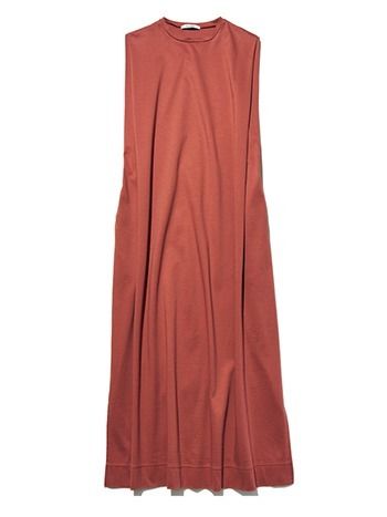 ブリックノースリーブタックワンピース 16,500円/SLOANE(ザ ショップ スローン 新静岡セノバ店) 肩口をやや広めに、アーム部分にもゆとりを持たせることで肩から腕の上部を細く見せる設計。カットソー素材特有の縦落ちするとろみ感で、まっすぐなシルエットを形成。そで口のタックで脇が見えない配慮も。