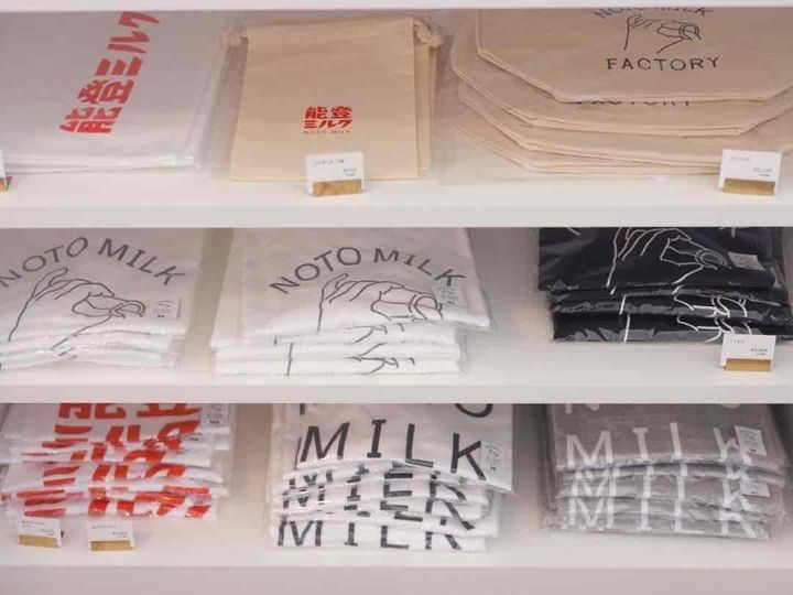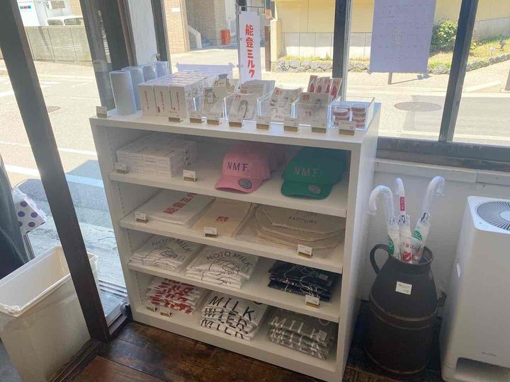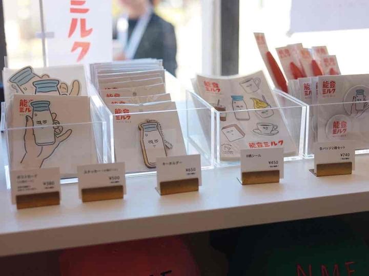 能登ミルクせせらぎ通り店の店内では、能登出身のイラストレーター「モリモトシンゴ」さんが描いたイラストの能登ミルクオリジナルグッズが販売されています。