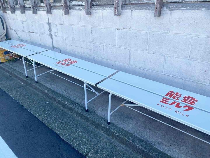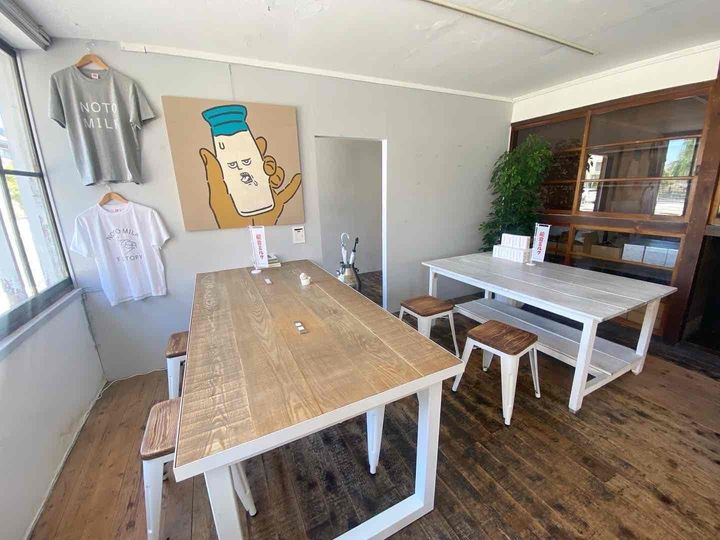 能登ミルクせせらぎ通り店は、建物1階の向かって右手に入っています。外にはレトロ感のあるロゴがプリントされたベンチが。店内にも「能登ミルク」の文字と牛乳のモチーフがいっぱいでかわいい!