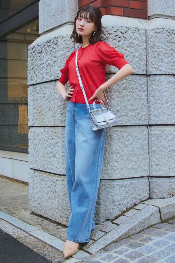 デニムスタイルにカジュアルバッグを合わせるとどうしてもご近所感が出やすいので、小さいピリ辛バッグをアクセのように取り入れるのがおすすめ。鮮やかな赤をきかせてデニムをパリっぽく着こなしたら、シルバーバックの斜めがけでパンチをオン。全面シルバーのインパクトを、ミニショルダーでさらりと。