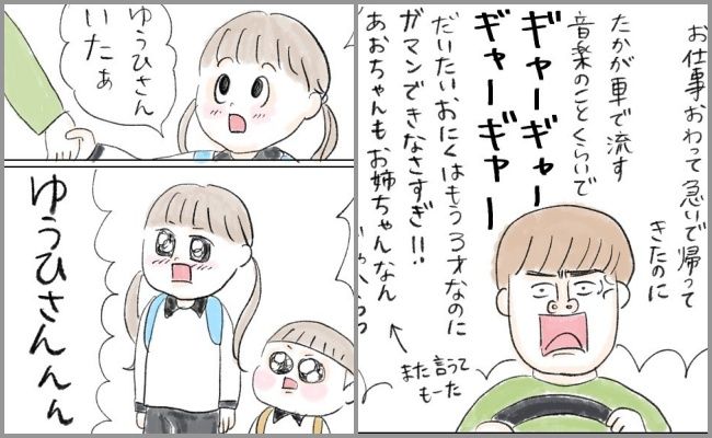2015年生まれの娘と2018年生まれの息子を子育て中のあいぽんさんが描く育児マンガをご紹介! 今回は、あいぽんさんが運転しているときに子どもたちのきょうだいゲンカが勃発したときのエピソードをお届けします♪娘の保育園のお迎えに行った帰り道、車内に流す音楽で意見が対立し始めた子どもたち。次第にヒートアップしていく言い合いに、あいぽんの我慢の意図は限界を迎えてしまいます。そして、ついに「あーもう、やかましい!」と声を荒らげてしまって……!?