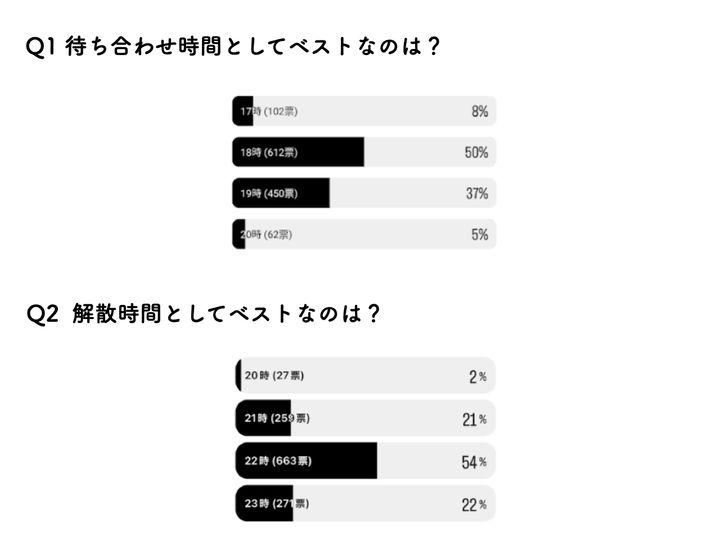 まず待ち合わせ時間について聞いてみると、8割強の人が「18時」もしくは「19時」と回答してくれました。集合時間はディナータイムの少し前くらいに設定するのが良さそうです。