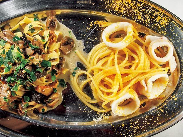 左 複数種のきのこのタリアテッレ、右 ヤリイカとからすみのスパゲッティ
