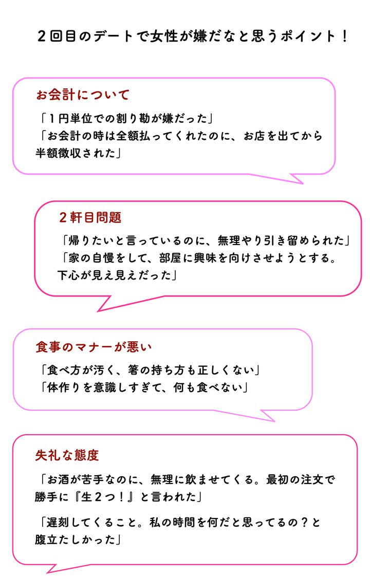 せっかくデートが盛り上がったとしても「もう1軒行こう」としつこく引き留めたり、スマートにお会計できないことで「この人とは付き合えないな…」と思ってしまう女性が多い様子。