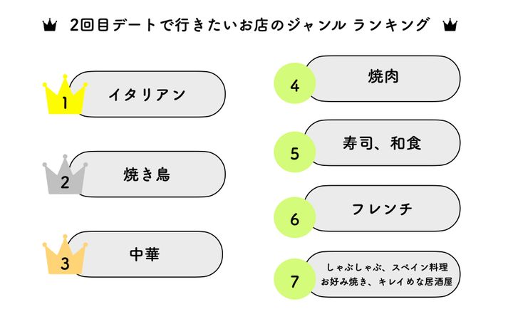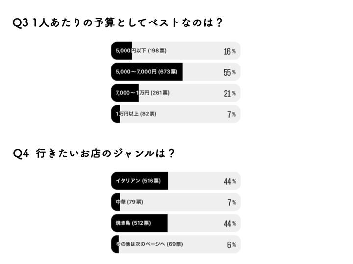 そして、どんなジャンルのお店に行きたいかについても尋ねてみると、なんと「イタリアン」と「焼き鳥」がほぼ同数票という結果に!