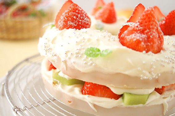 ショートケーキをスポンジ生地から作るのは大変ですが、バームクーヘンを土台にすれば楽チン。表面にホイップクリームを塗り、イチゴを飾って完成です。お菓子作り初心者でも気軽に挑戦できそうですね。