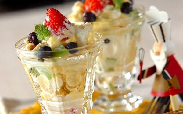 グラスにバームクーヘン、フルーツ、カスタードを重ねるだけで、ちょっと特別なおやつの出来上がり。カスタードは電子レンジで簡単に作れます。大きめの器で作って、みんなで取り分けても楽しいですね。