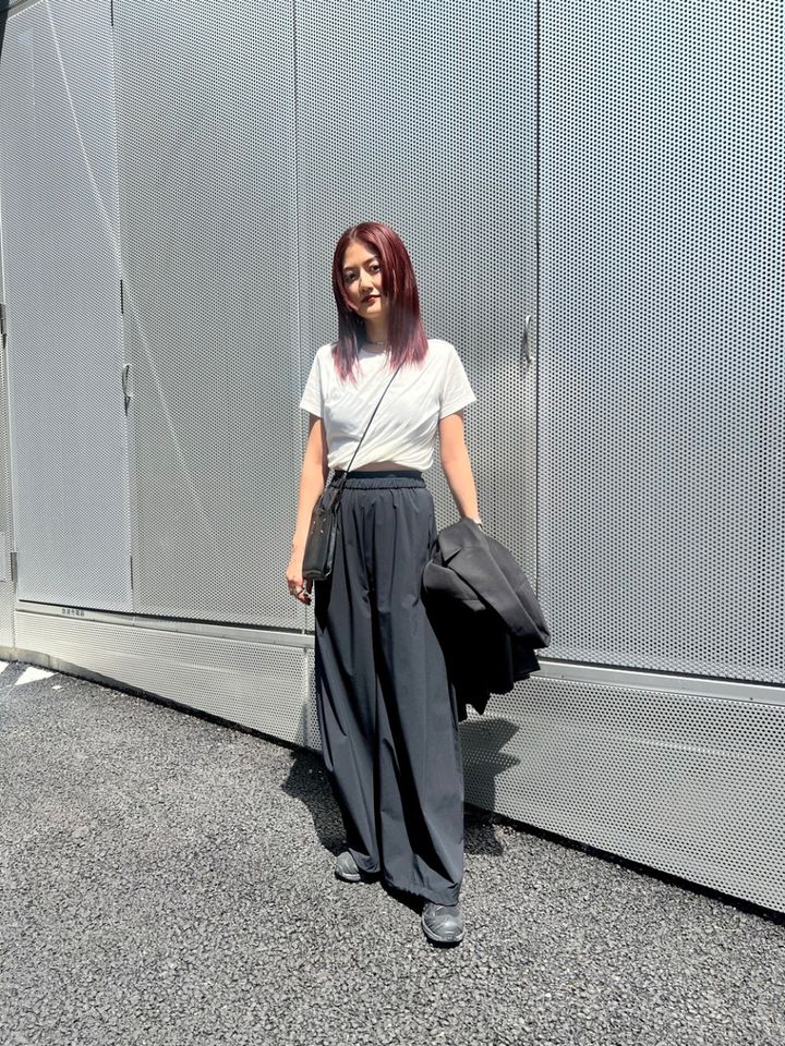 「白Tをメインに、ほどよい肌見せで明るめモノトーンコーデに仕上げました。ツイストディティールのTシャツや、ウエストがダブルウエスト仕様になったレイヤード風デザインのパンツなど、シンプルなスタイリングながらも小技のきいたアイテム同士の合わせでこなれ感を出しました。ジャケットで少しかっちりまとめようと思いましたが日中は暑くて断念、潔く手持ちに(笑)。朝晩の涼しいときに羽織って印象の変化も楽しみたいスタイリングです」