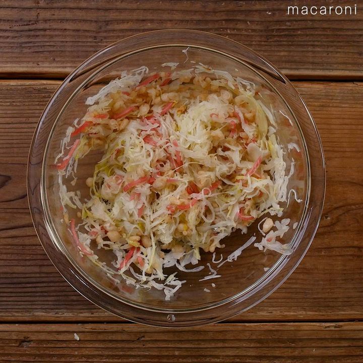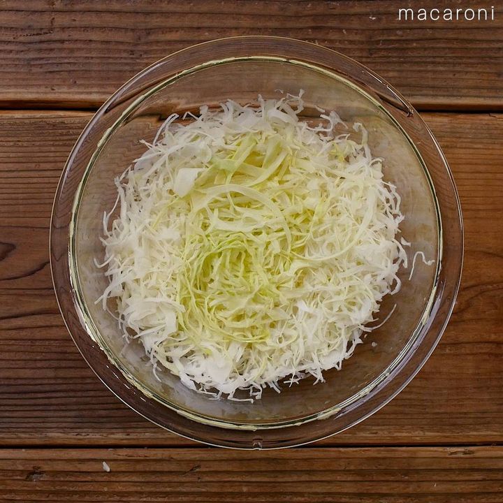 1: ボウルにキャベツを入れ、ふんわりとラップをかけてレンジ600Wで2分加熱します。