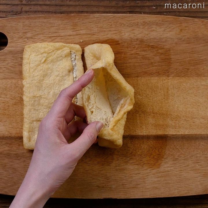 油揚げは菜箸で転がすことによって開きやすくなります。破れないようそっと開いてくださいね。