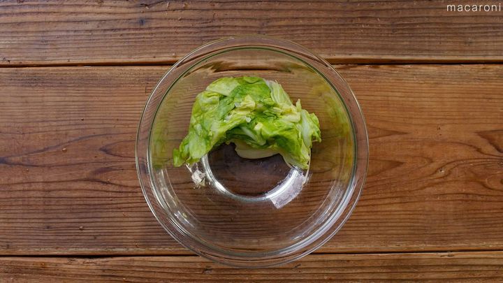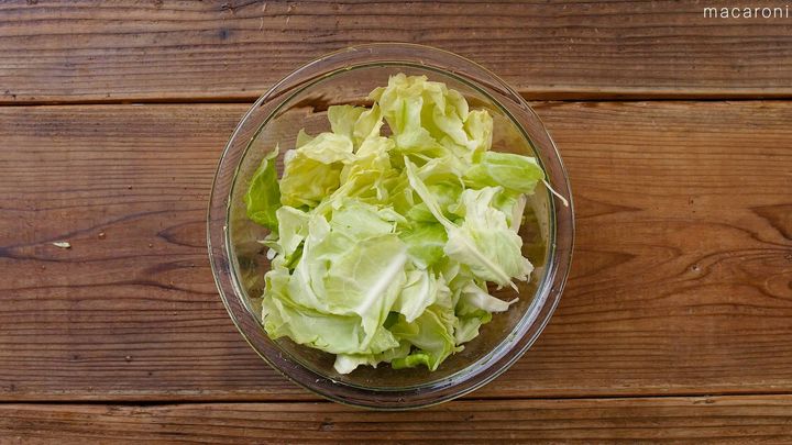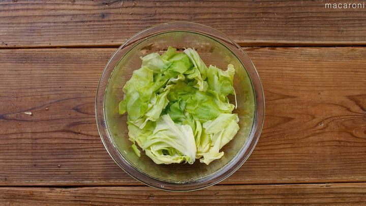 2: 耐熱容器にキャベツを入れ、ラップをかけてレンジ600Wで2分加熱します。