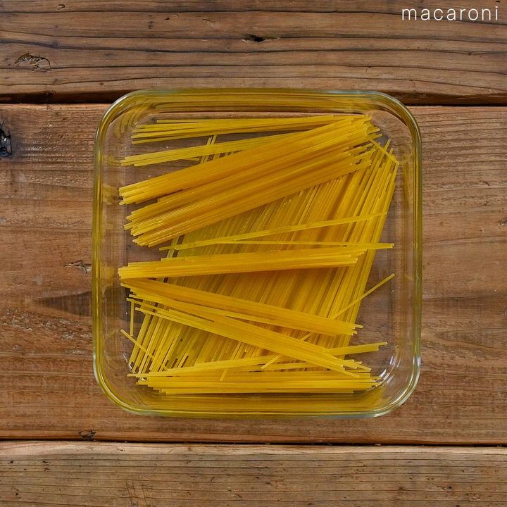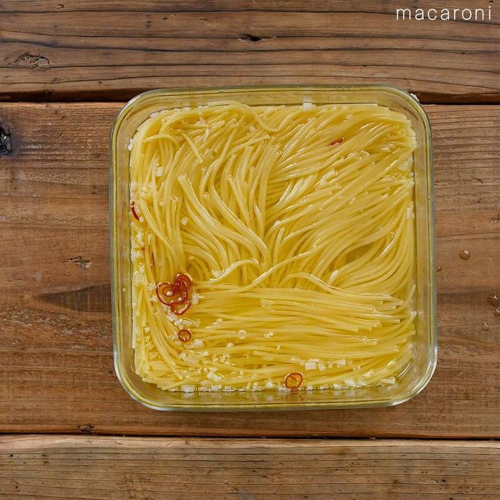 2: 耐熱容器にスパゲッティを半分に折って入れ、オリーブオイルを加えて絡めます。
