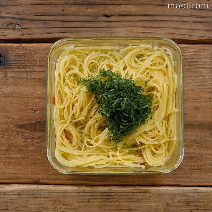 大葉のさわやかな香りがやみつきになるパスタです。パスタにオイルを絡ませてからレンジ加熱することで、パスタ同士がくっつきにくくなりますよ。忙しい日のランチや大葉の消費に、ぜひ作ってみてください!