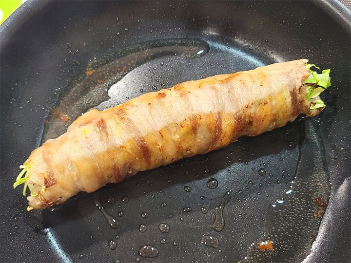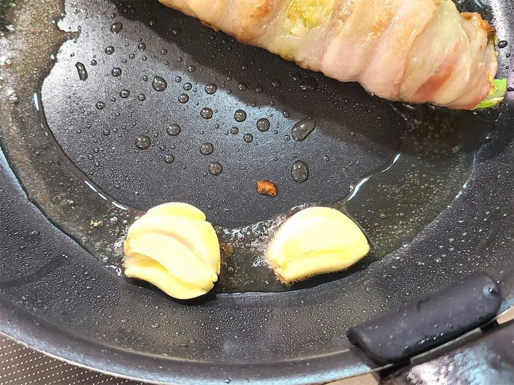 6.  フッ素樹脂加工のフライパンを油を引かず中火で熱し、巻き終わりを下にして4の肉巻きキャベツを焼きます。全面焼き目がつくまで転がしながらじっくり焼いたら、つぶしたにんにくをいれ、豚肉から出た脂で軽く炒めます。その後火を止めフタをして、余熱で中まで火を入れます。だいたい5分くらい置きましょう。