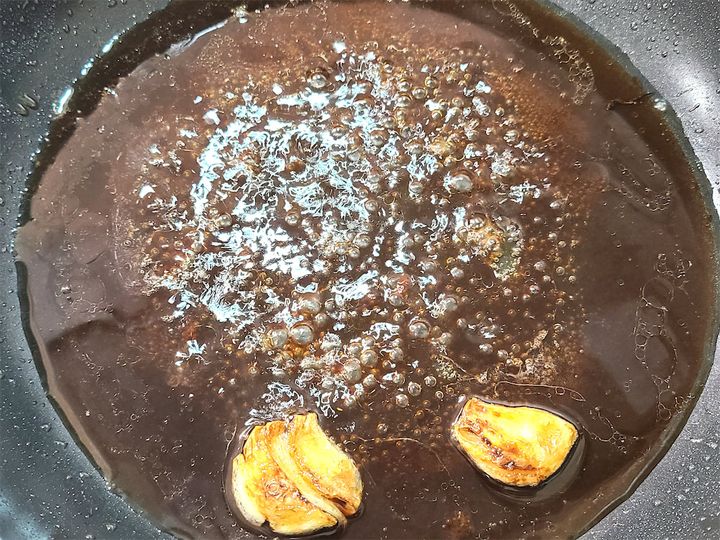 7.  完成したら切ってお皿に盛ります。フライパンに残った脂とにんにくはそのままで、5の合わせ調味料を加えて中火で2分ほど熱します。