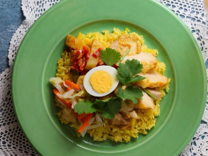 スイートチリソースや野菜の甘酢漬けをあわせて食べるタイ風鶏肉の炊き込みご飯
