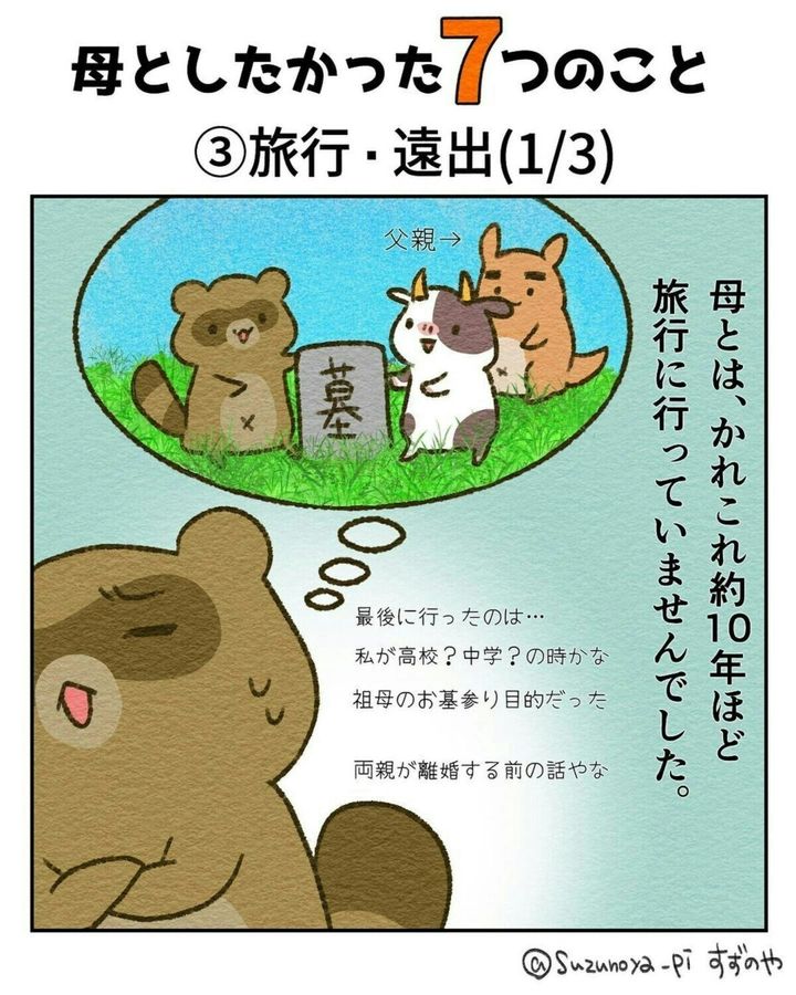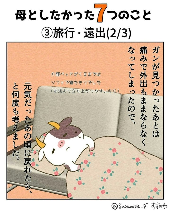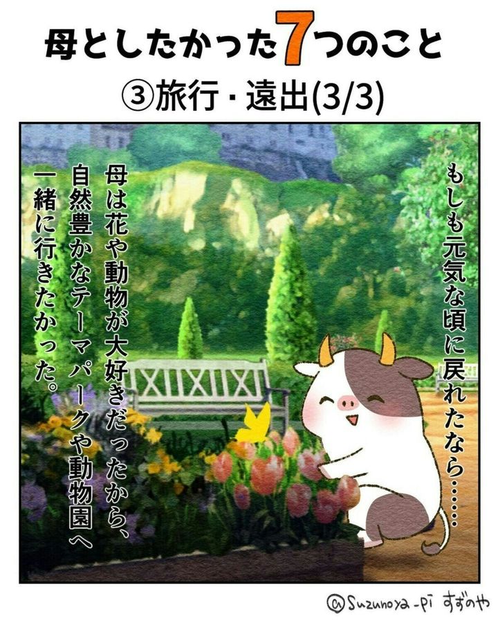 旅行や遠出などは、体力がある元気なうちじゃないと、難しいものですね。花や動物が大好きだったという すずのやさんの母。一緒に楽しみたかった気持ちが伝わってきます。