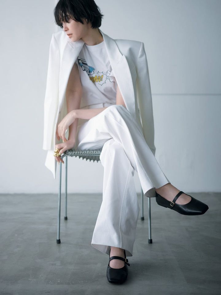 メリージェーン[ヒール0.8㎝]¥95,700(マリア ルカ/ガリャルダガランテ 青山店)、ジャケット¥62,700、パンツ¥33,000(共にカルバン・クライン/カルバン・クライン カスタマーサービス)、Tシャツ¥14,300(バットシェバ/エディット フォー ルル)、ピアス¥33,000(ete)、リング¥3,590(ザラ/ザラ カスタマーサービス)
