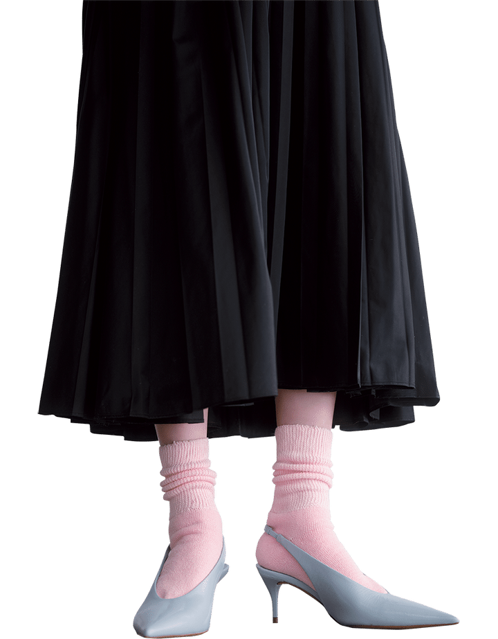 パンプス[ヒール5㎝]¥13,590(ザラ/ザラ カスタマーサービス)、スカート¥49,500(エンフォルド)、ソックス※3足セット¥2,640(ザ レイルロード ソック/メイデン・カンパニー)