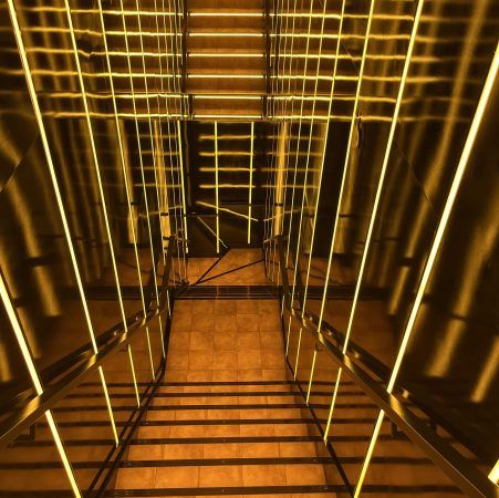 入口も、注文もオーダーも基本は無人のセルフサービス型。最先端の時間制カフェは、まるで近未来のような階段を下りていくと地下に続いています。