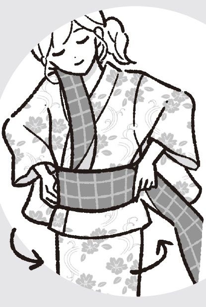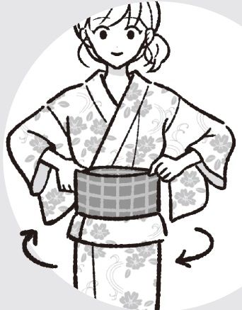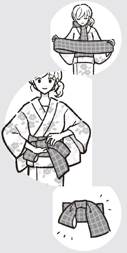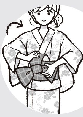 帯を幅半分に折って肩幅程度の長さを右肩にかけたら、体を回転させながら残りを巻く。