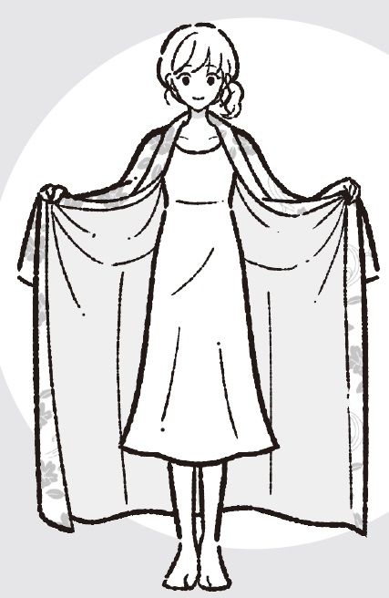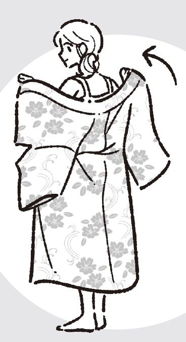 左右の衿を持ち、肩からかけるように羽織る。背縫いがまっすぐになるように意識すること。