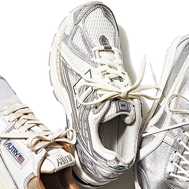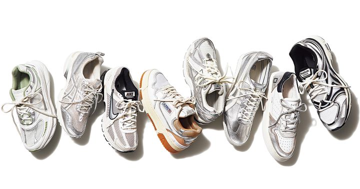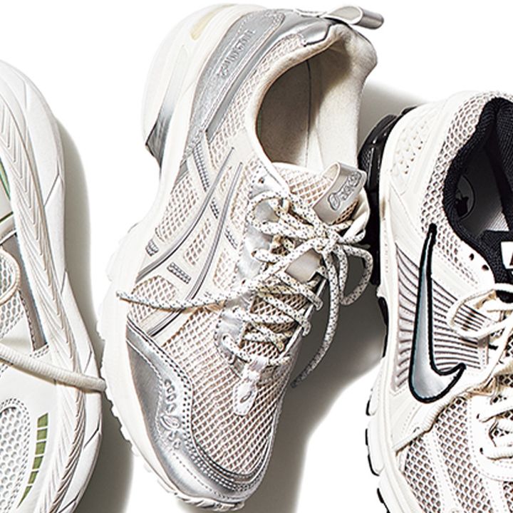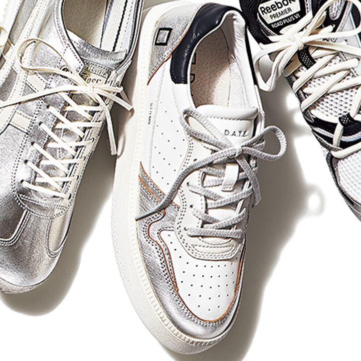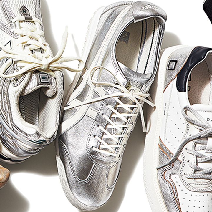モノトーンコーデの足元に色を差すのもいいけれど、シルバースニーカーなら馴染みながらキラリ感がアクセントになって今っぽい。