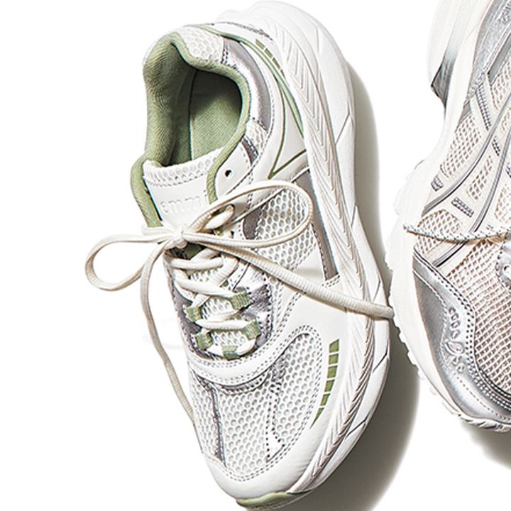 シンプルなローテクタイプで、シルバーに馴染むホワイトライン使いの一足だから、足元がカジュアルになりすぎず、甘めコーデにマッチ。