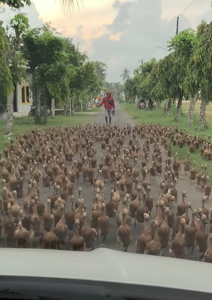 アヒルの群れでした! 数えきれないほどの数のアヒルが道いっぱいに広がって移動していたのです。