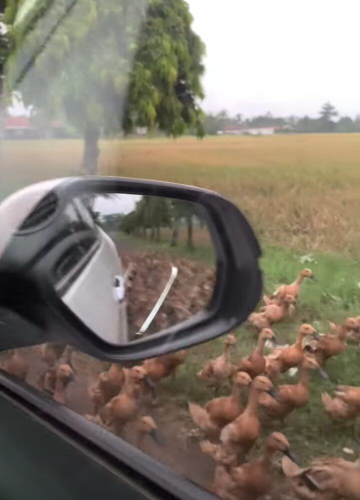 そして、撮影者さんの乗る車を取り囲むようにしてアヒルたちは横を通過していきます。 これはもうしばらくの間、車を止めてアヒルたちが通り過ぎるのを待たないといけないようです。
