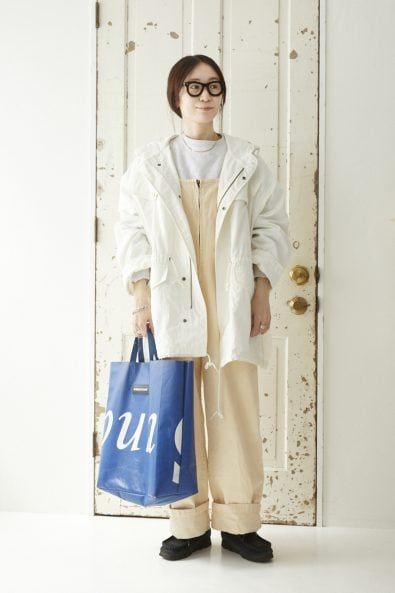 「バッグは長く愛用している《フライターグ》のトート。パキッとしたブルーですが、意外に合わせやすいです。単調な着こなしのアクセントにちょうどいい、大きめのロゴもポイントになります♡」