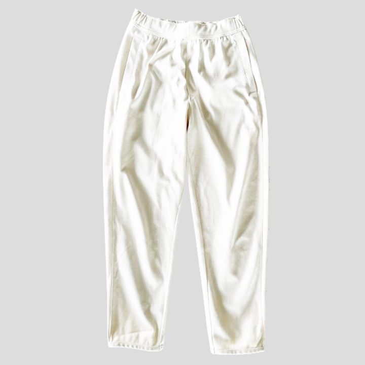 コットンとポリエステルのブレンド素材で白でも透け感は全くなし。スウェット感覚で穿けるので動きやすさはNo. 1です。しっかりした生地で高見えも!